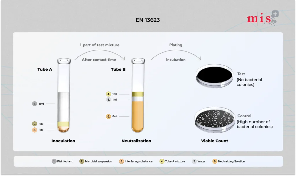 BS EN 13623 is a phase 2, step 1 suspension test for antiseptics and chemical disinfectants planned to be used in water systems against Legionella pneumophila. To meet the efficacy criteria of EN 13623 test, the test product must kill microbes to a value of 4 log reduction.