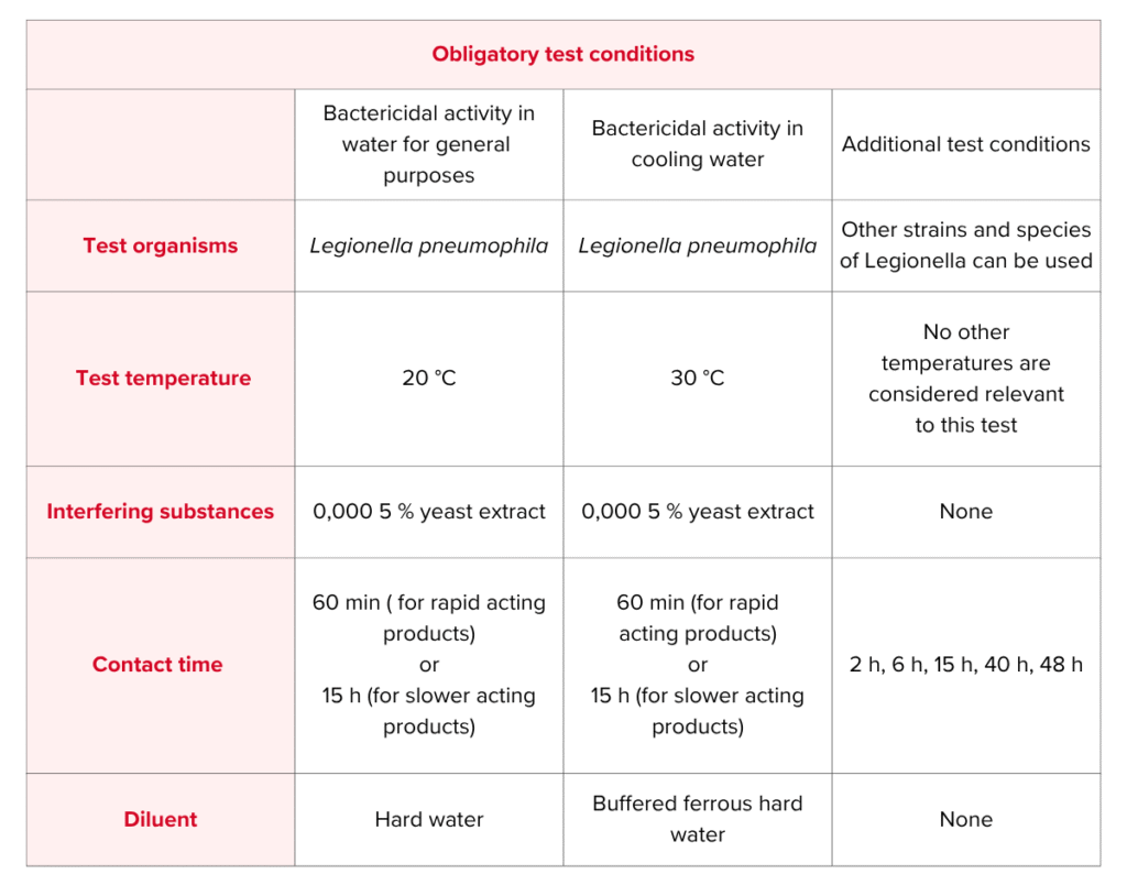 EN 13623 is designed for chemical disinfectants/ antiseptics intended to be used in aqueous systems to eliminate Legionella pneumophila.