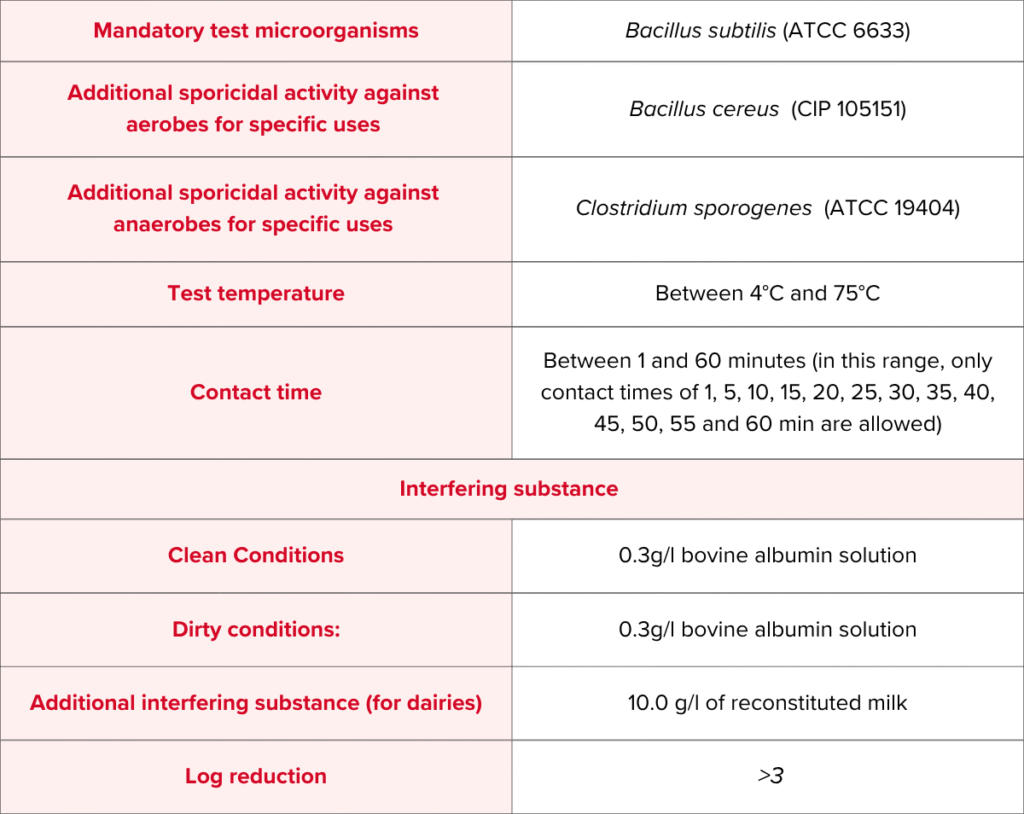 EN 13704 test is performed using practical conditions to determine whether a given chemical disinfectant is capable of showing sporicidal action in the intended area of use. However, this test is not implemented for situations where disinfection is medically indicated and to products used for disinfection of living tissues.