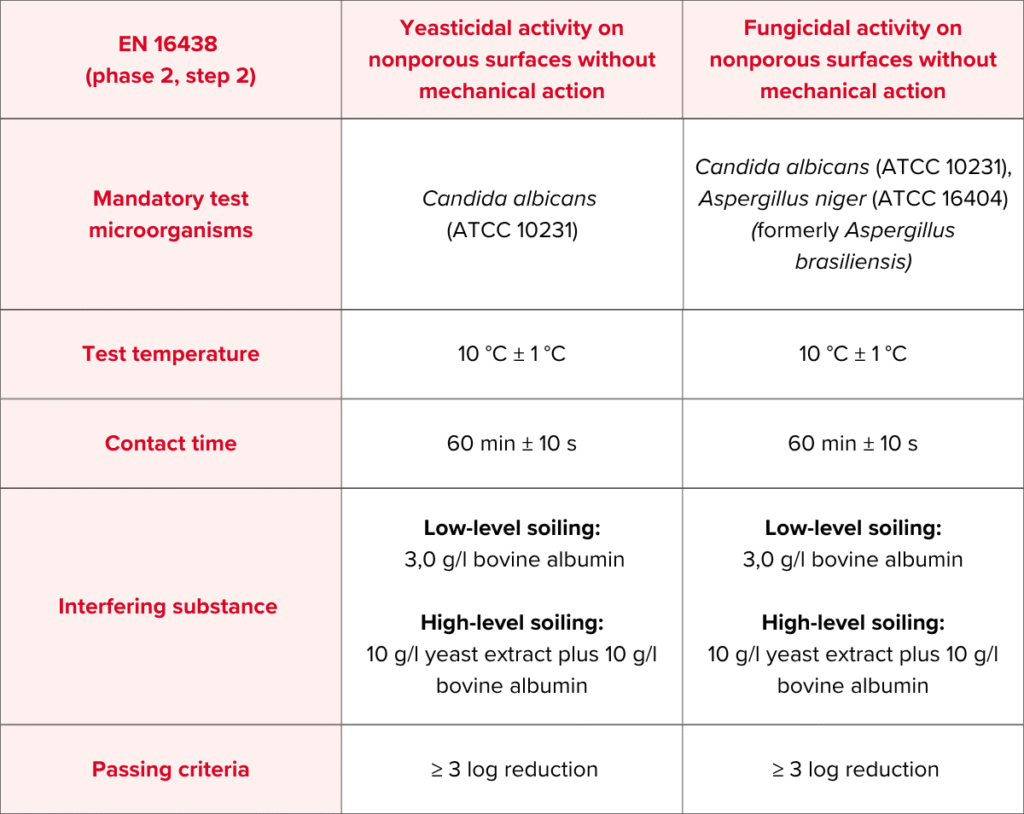 As per European norms, veterinary disinfectants claiming fungicidal or yeasticidal must be tested for their efficacy under standardized methods. EN 16438 standard is established to check microbicidal activity of product samples against Candida albicans and Aspergillus niger under conditions mimicking situations for their respective area of application.