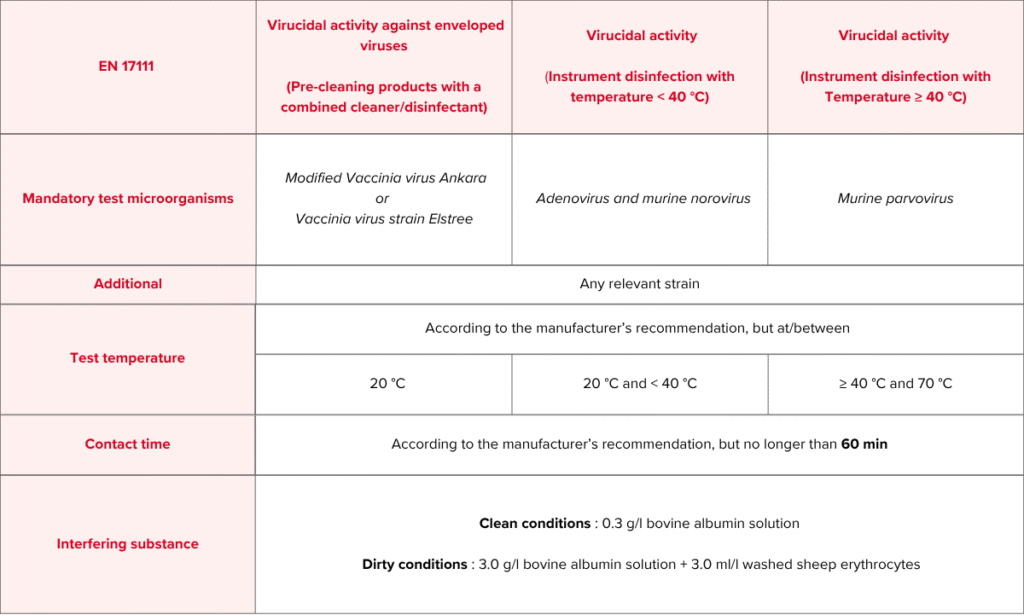 EN 17111 complements EN 16777, which assesses virucidal activity on non-porous surfaces without immersion or mechanical action. It also extends the principles of EN 14476  (phase 2 step 1 test) which establishes the baseline for virucidal efficacy assessment to more practical conditions. For a product to claim general virucidal activity, it must meet EN 14476 requirements with Poliovirus, Adenovirus, and murine Norovirus, and EN 16777 requirements with Adenovirus and murine Norovirus
